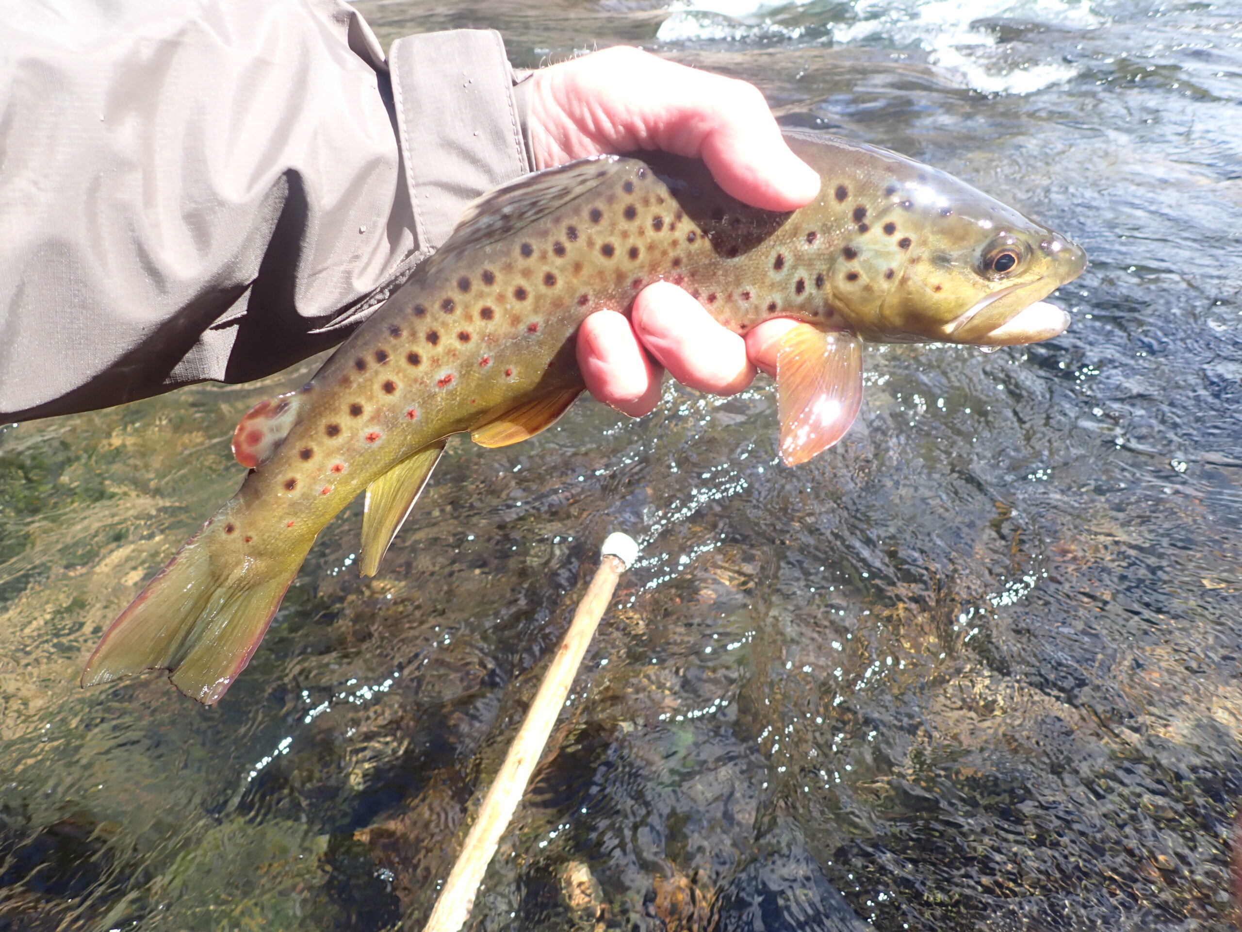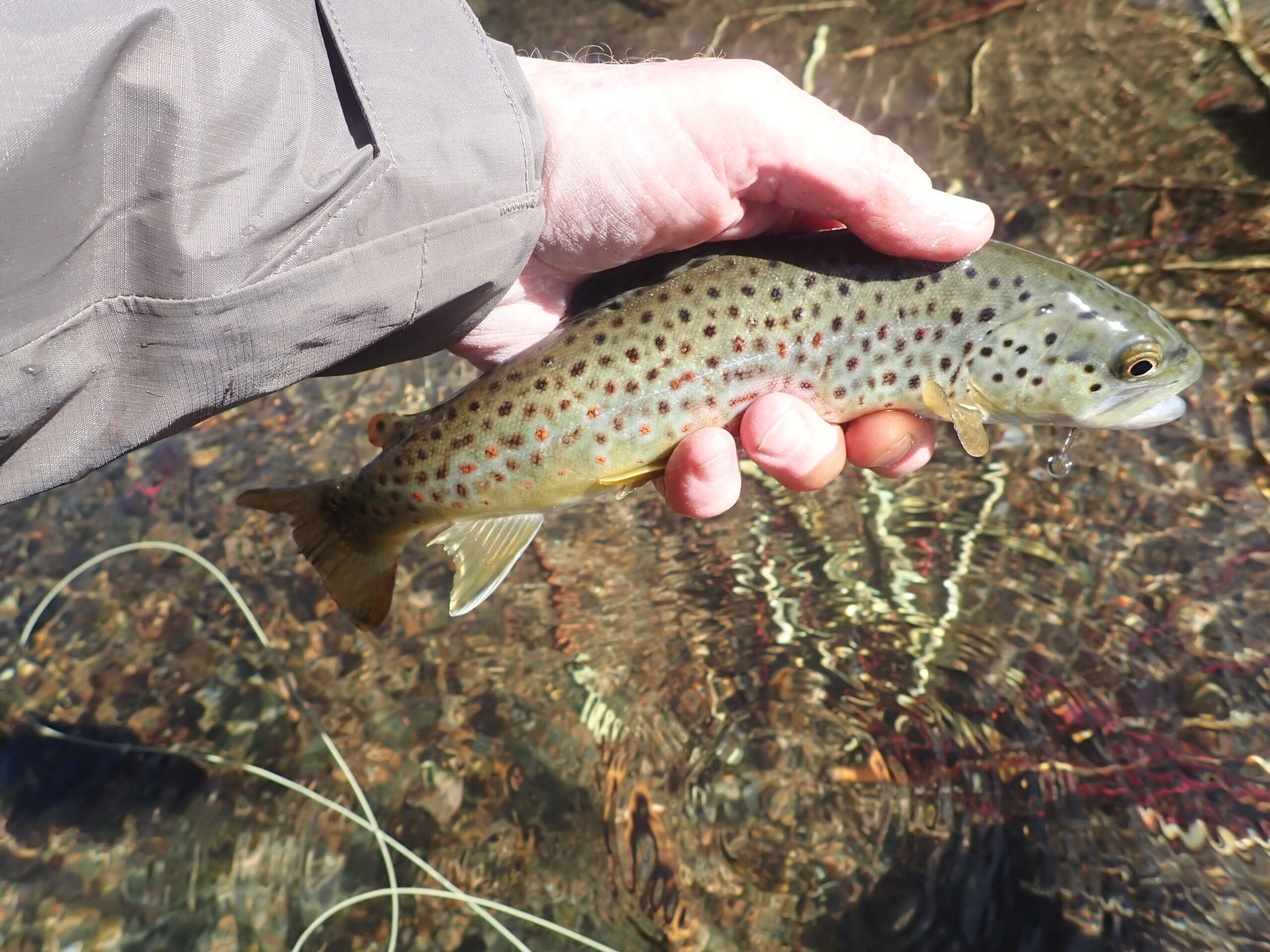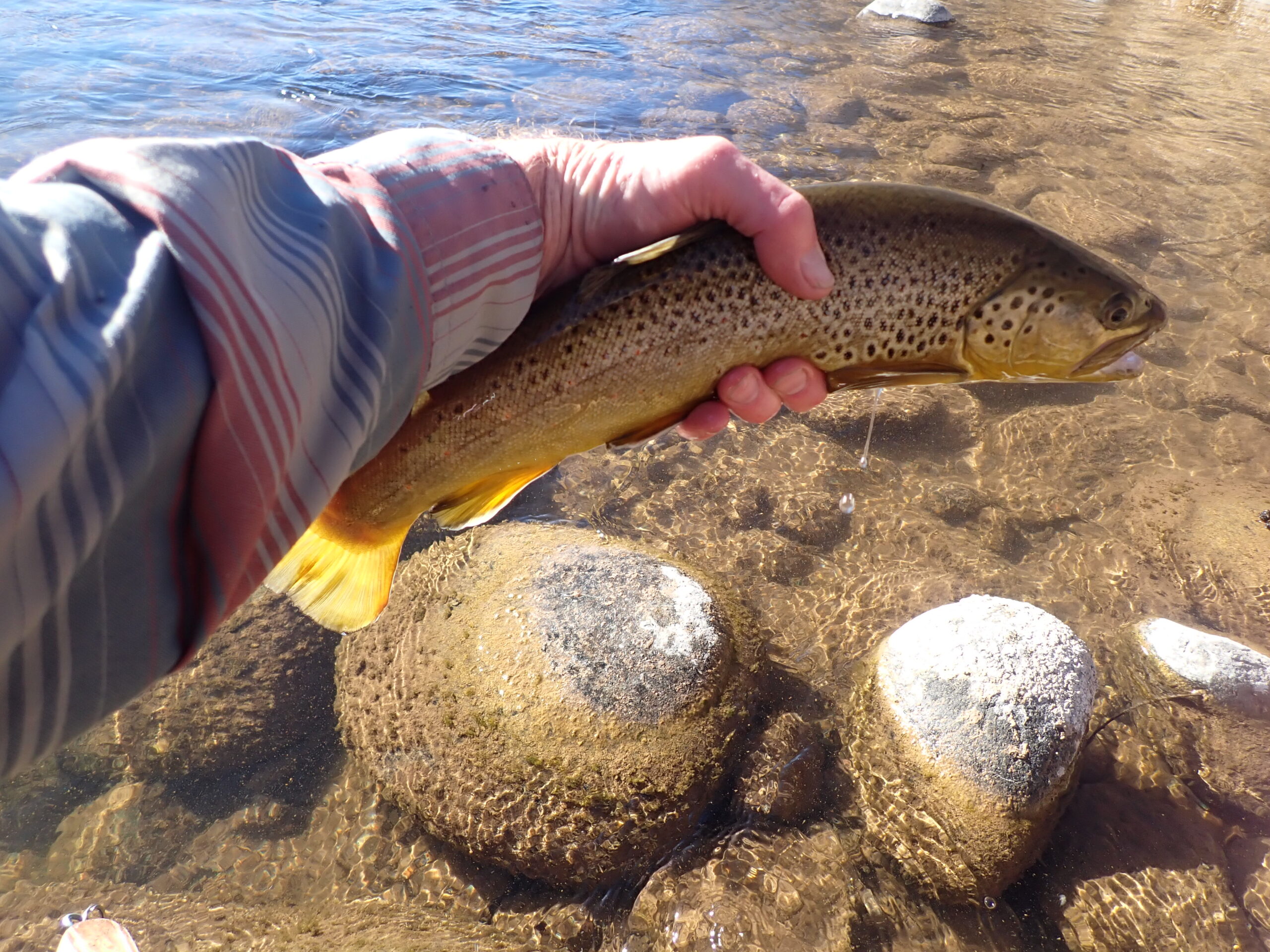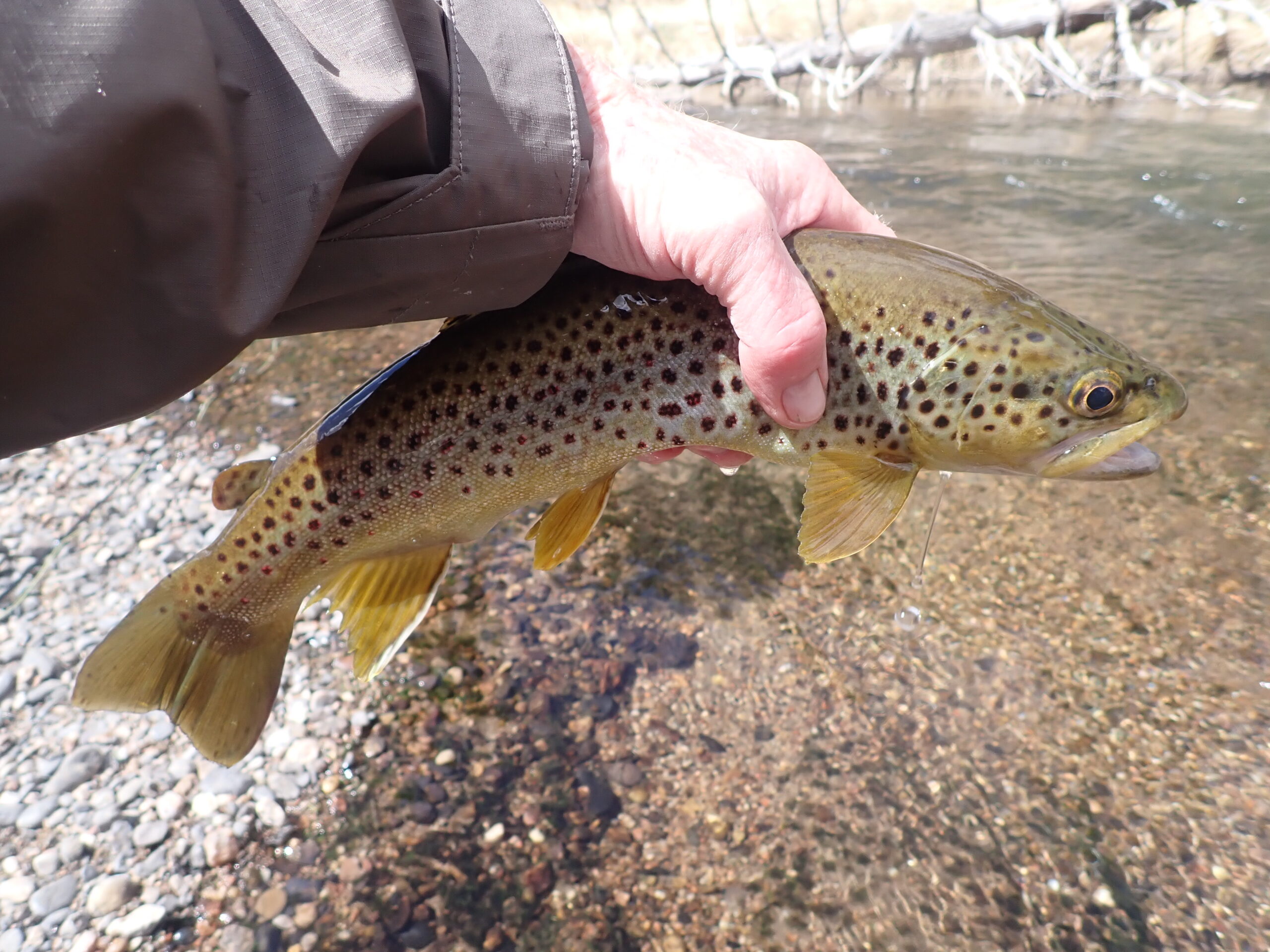 After I covered the attractive pockets and slots, I found a place to cross the river, and then I ambled down the river for .1 mile to another favorite spot, where I could work some deep seams. I was getting no action on the olive perdigon, so I substituted a 20 incher and kept the go2 caddis on the point. Before I adjourned at noon for lunch, I added three brown trout to my count. One was shorter than twelve inches, but the other two were very respectable wild fish in the thirteen inch range. All three grabbed the 20 incher, thus, validating my switch from the perdigon.