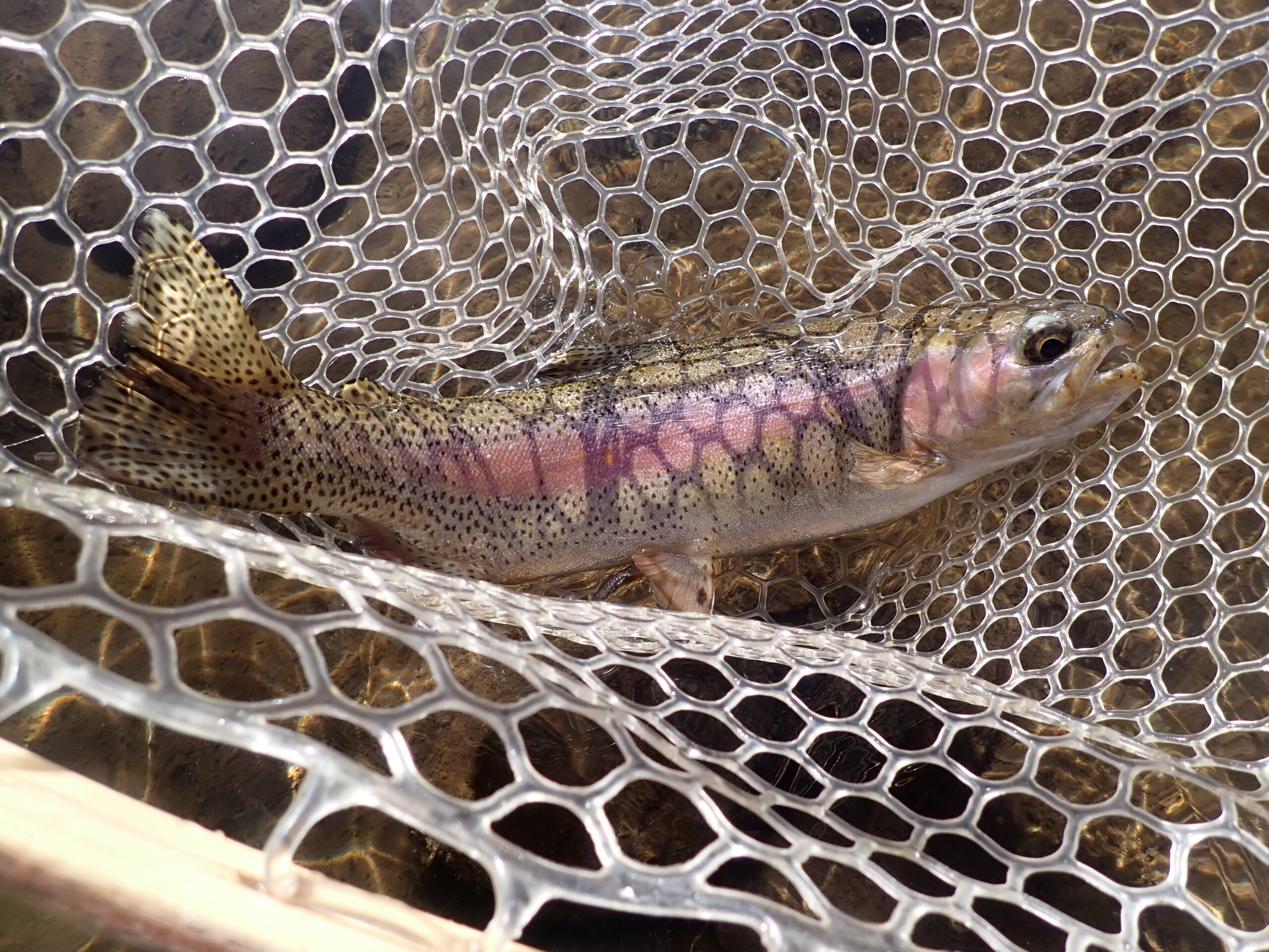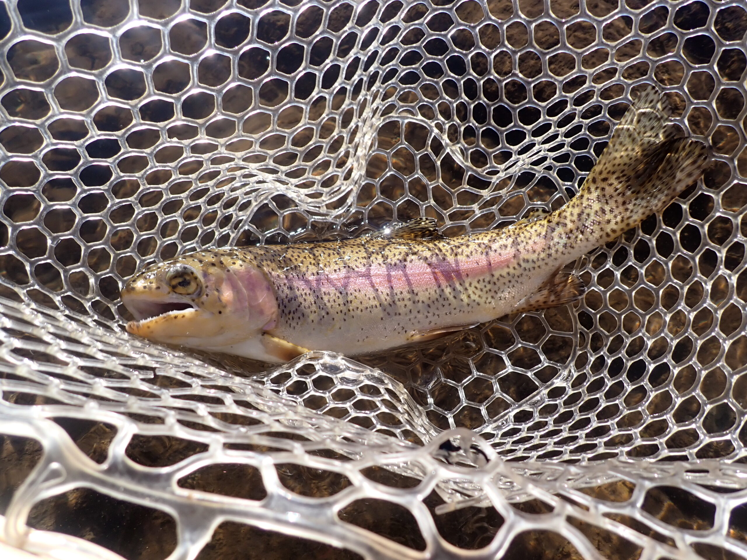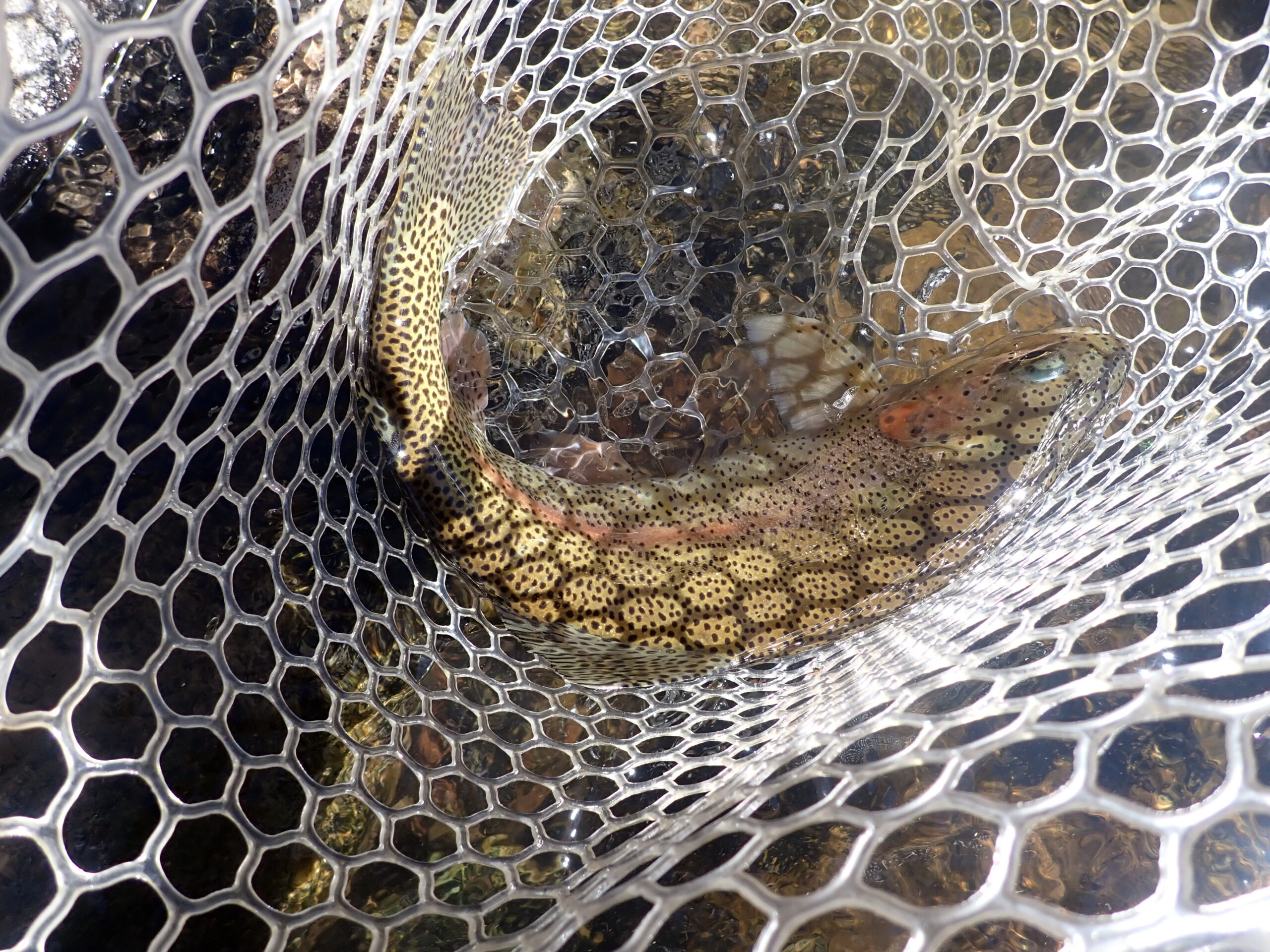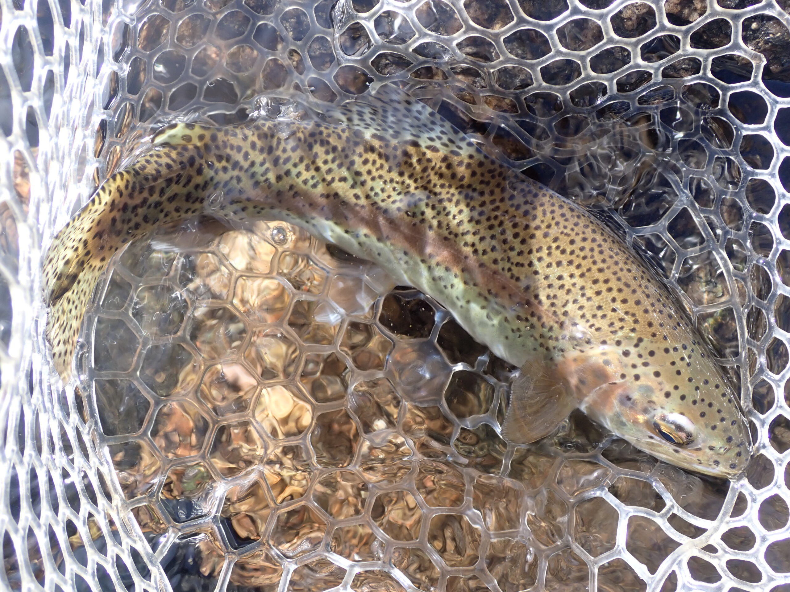 When I arrived, my car was the only one in the vicinity, but as I prepared to fish, another angler parked forty yards farther west along the highway. He was ready before me, but fortunately he grabbed a spot directly across from his car, and I was not planning to fish that area. Instead I crossed the highway and began along a high bank across from my car. I chose an olive perdigon and a bright green go2 caddis pupa to begin my search for trout. in the first twenty minutes I managed to land a chunky rainbow trout in the sixteen inch range. When I scooped it in my net, I found the go2 caddis embedded in its lip. Needless to say, I was very pleased with this early success.