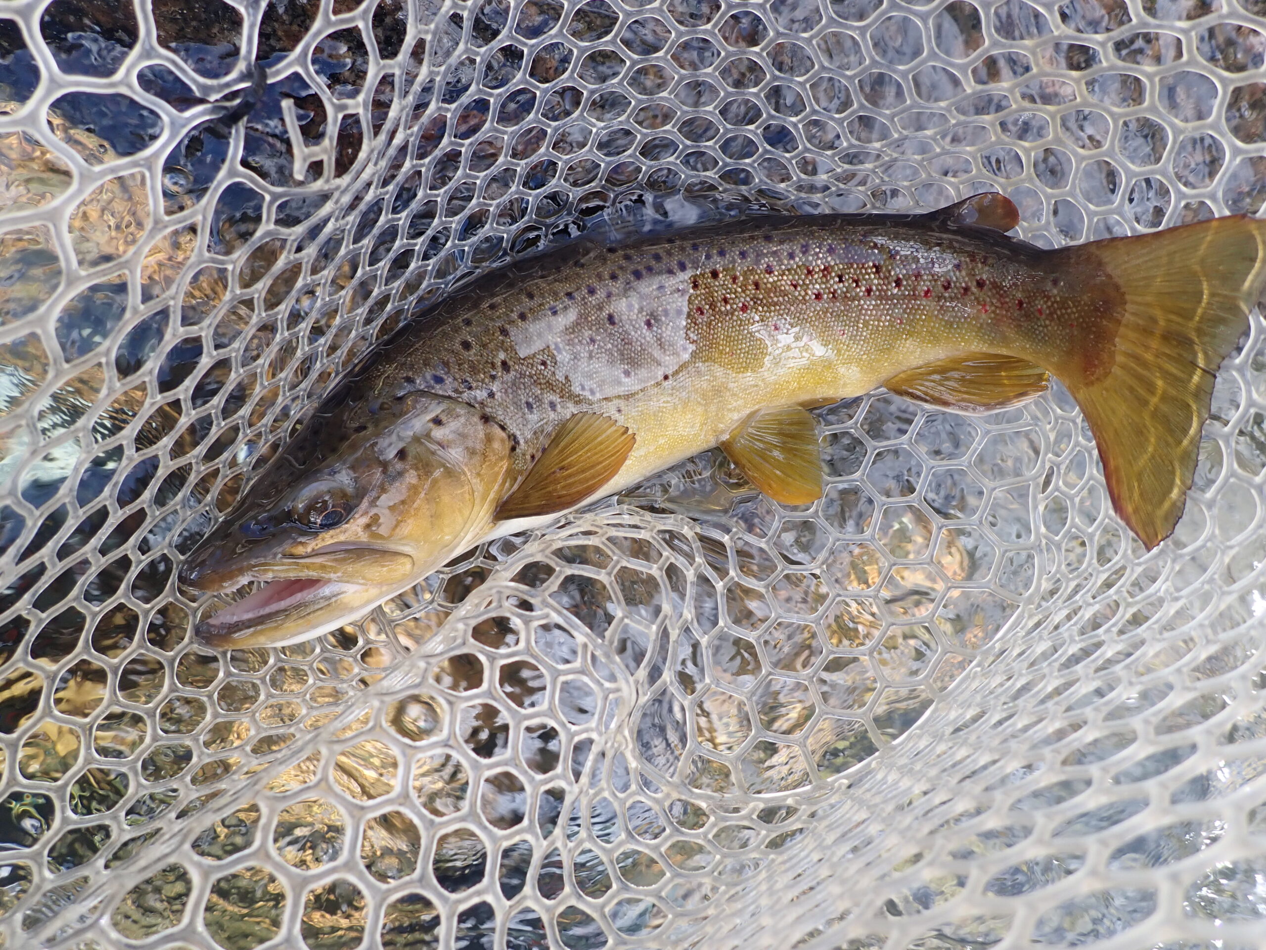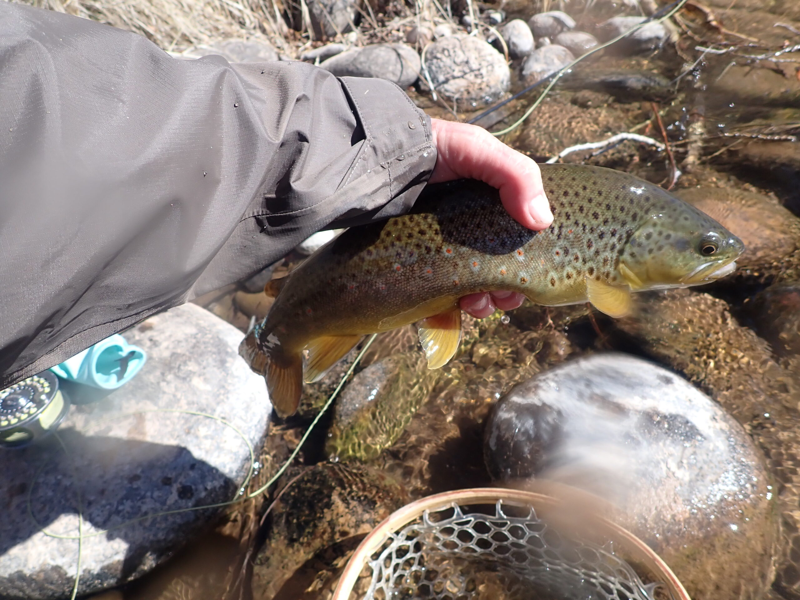 It took an hour to add the two fish after lunch, so it was rather slow going. I did observe three refusals to the chubby Chernobyl, and I shook loose a decent number of caddis, as I waded along the willows. I decided to give a double dry approach a try, so I knotted a peacock hippie stomper to my line and then added a size 14 olive-brown body deer hair caddis. I began prospecting with the dries, and within minutes I landed a small brown trout that recklessly crushed the caddis along the left bank. I directed my casts primarily to the edge of the river along the left bank; however, I did cover very attractive pockets and seams toward the middle of the river. Unfortunately the dry fly experiment did not pay additional dividends, so I abandoned it, as I approached a nice section with deep pockets and runs. I did see two or three fish elevate to inspect the caddis, but they never closed the deal with an eat.