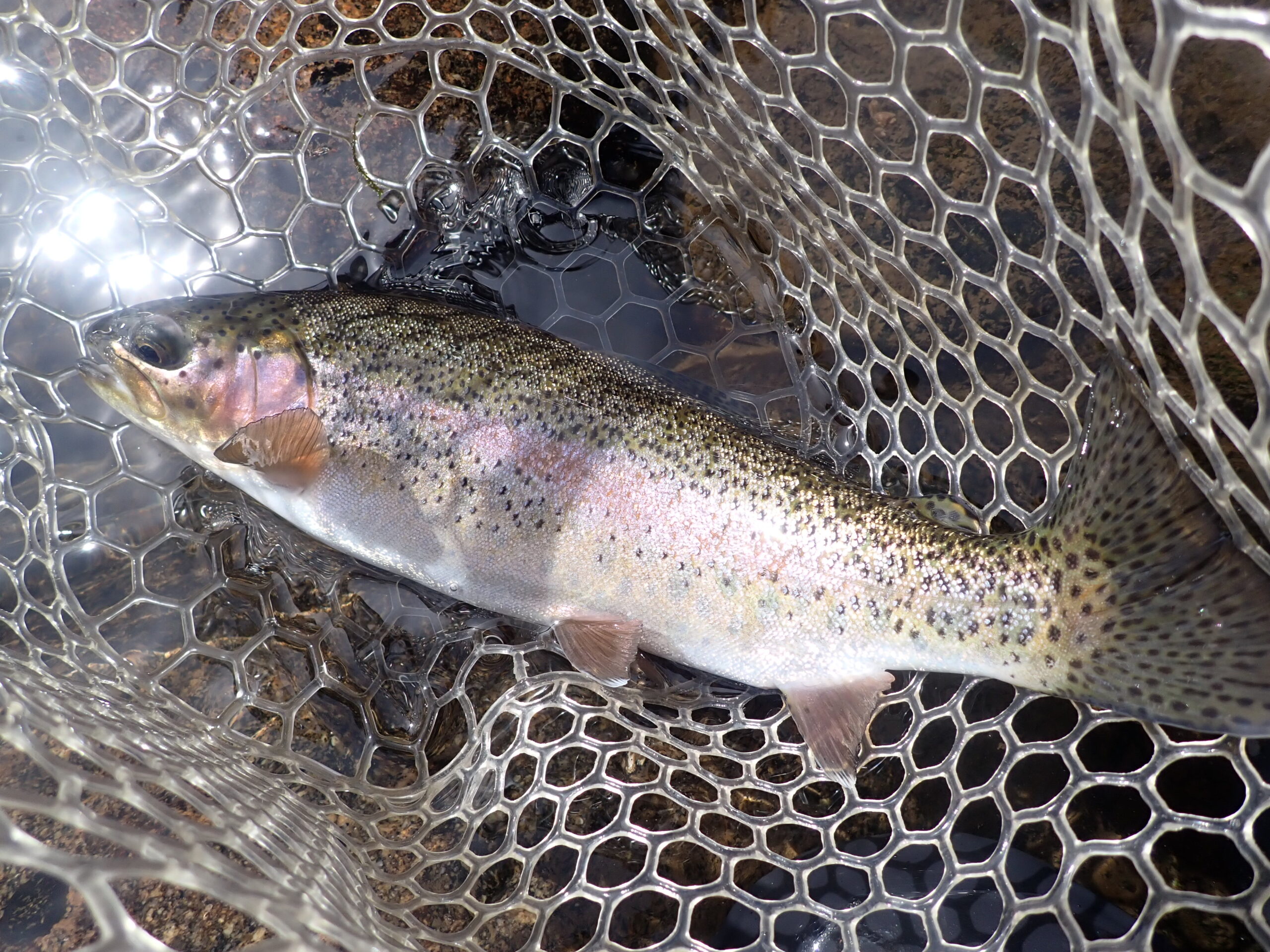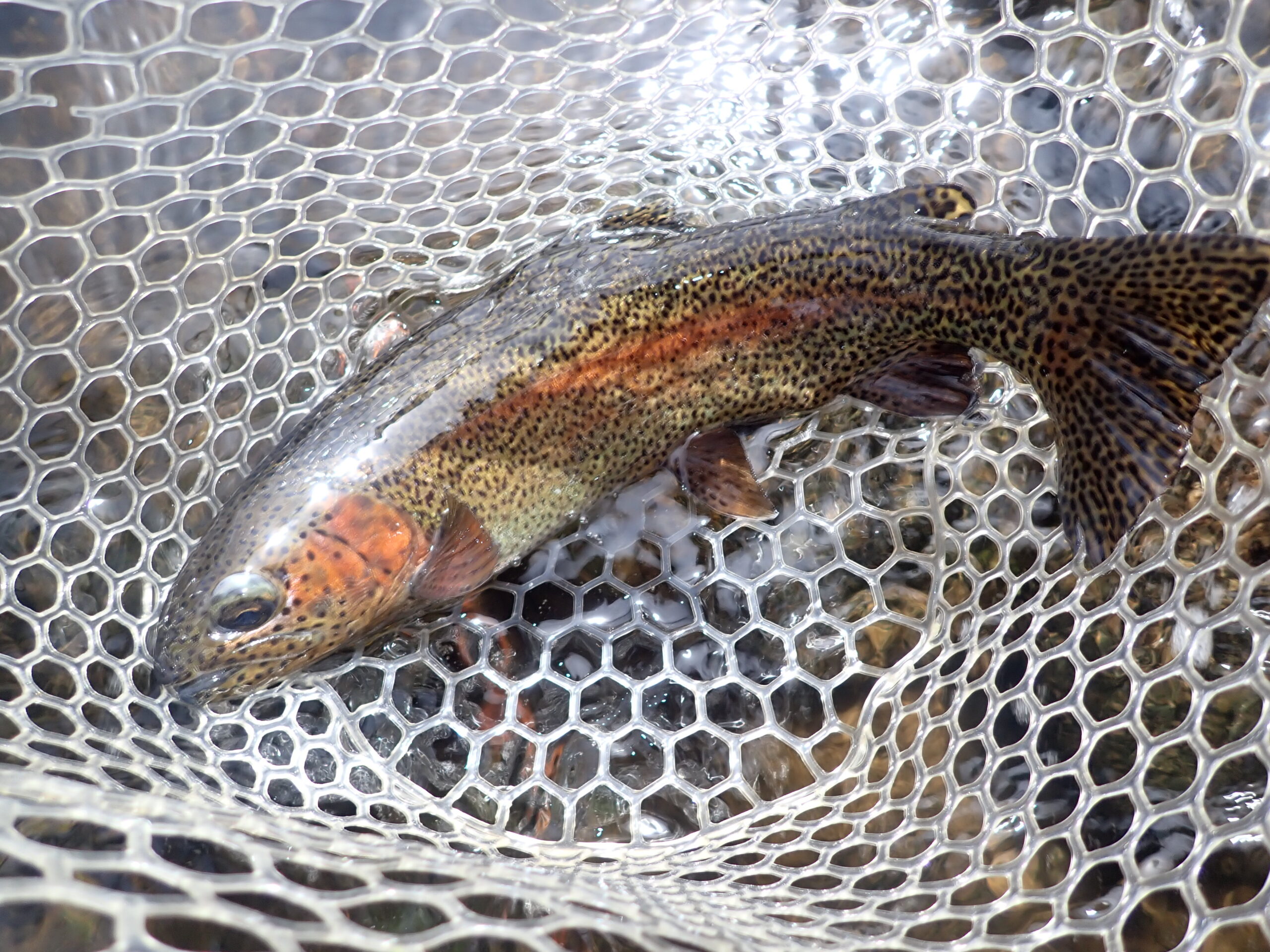 The rises in the “corner” area slowed, so I turned my attention upstream. A splashy rise upstream and left of center caught my attention, so I fired a series of casts to the area, and on the third drift, a fourteen inch rainbow smacked the hippie stomper. I was incredulous.