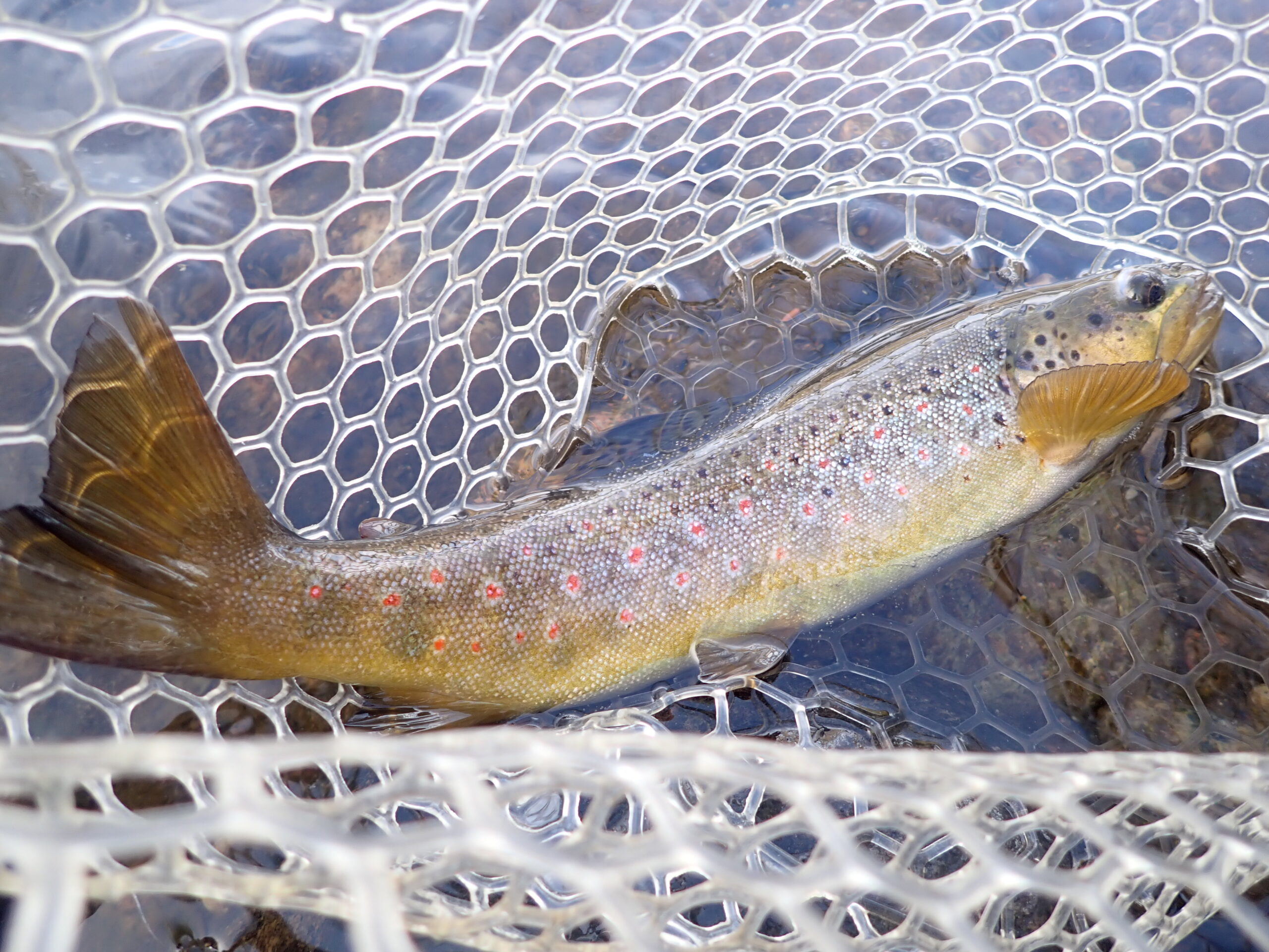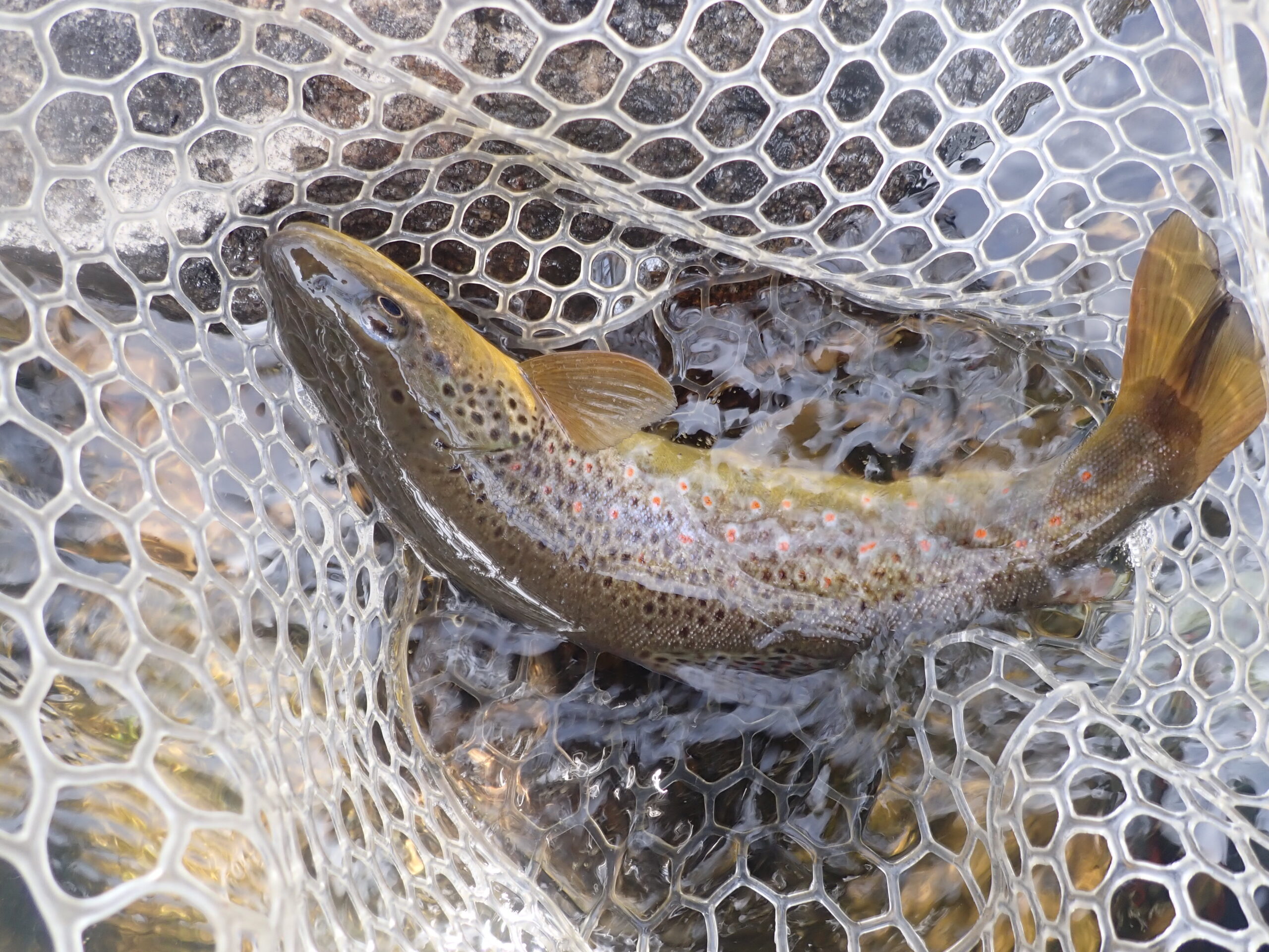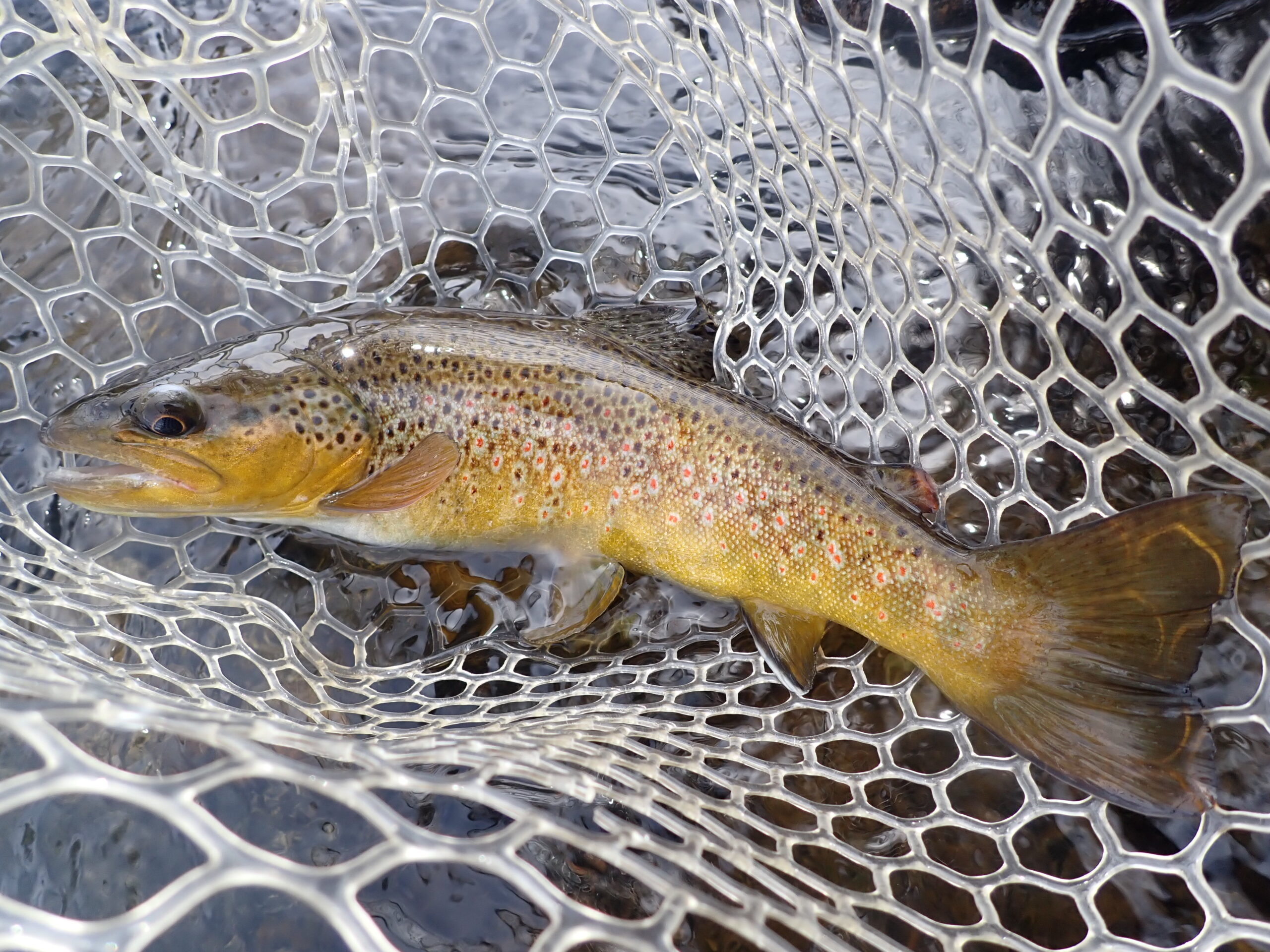 Once the flies were back in floating condition, I flicked another backhand cast to the middle of the run, and within seconds I noted a flash and bulge and set the hook. Once again a feisty brown trout in the thirteen to fourteen inch range slid into my net, and in this instance it displayed the mole fly in its lip. I chalked the hippie stomper eat to a low IQ fish and expected to cash in on the mole fly a few more times.