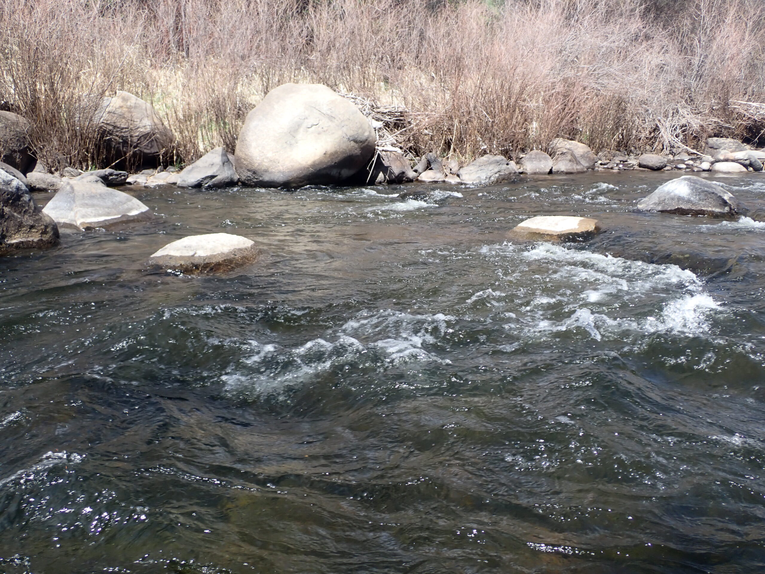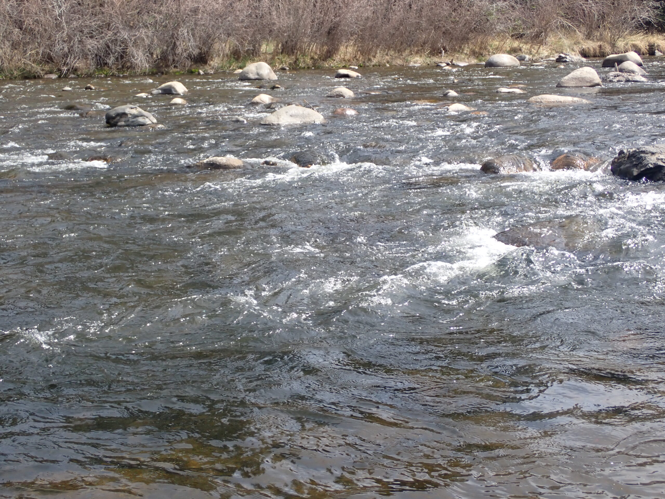 By 3:30PM I covered my targeted section of the river, so I hiked back to my crossing and completed my day. I achieved double digits and six of the landed fish were in excess of the twelve inch standard including two rainbows that exceeded fifteen inches. I have to admit that I was disappointed with the lack of dry fly action. I was convinced that prospecting with a deer hair caddis in the early afternoon would produce some results; but, alas, that was not the case. I spotted one blue wing olive, so perhaps it was too sunny, bright and windy, or I was on the downside of the baetis hatch. I suspect that another trip to the Arkansas River would take me upriver to the Salida area or above.