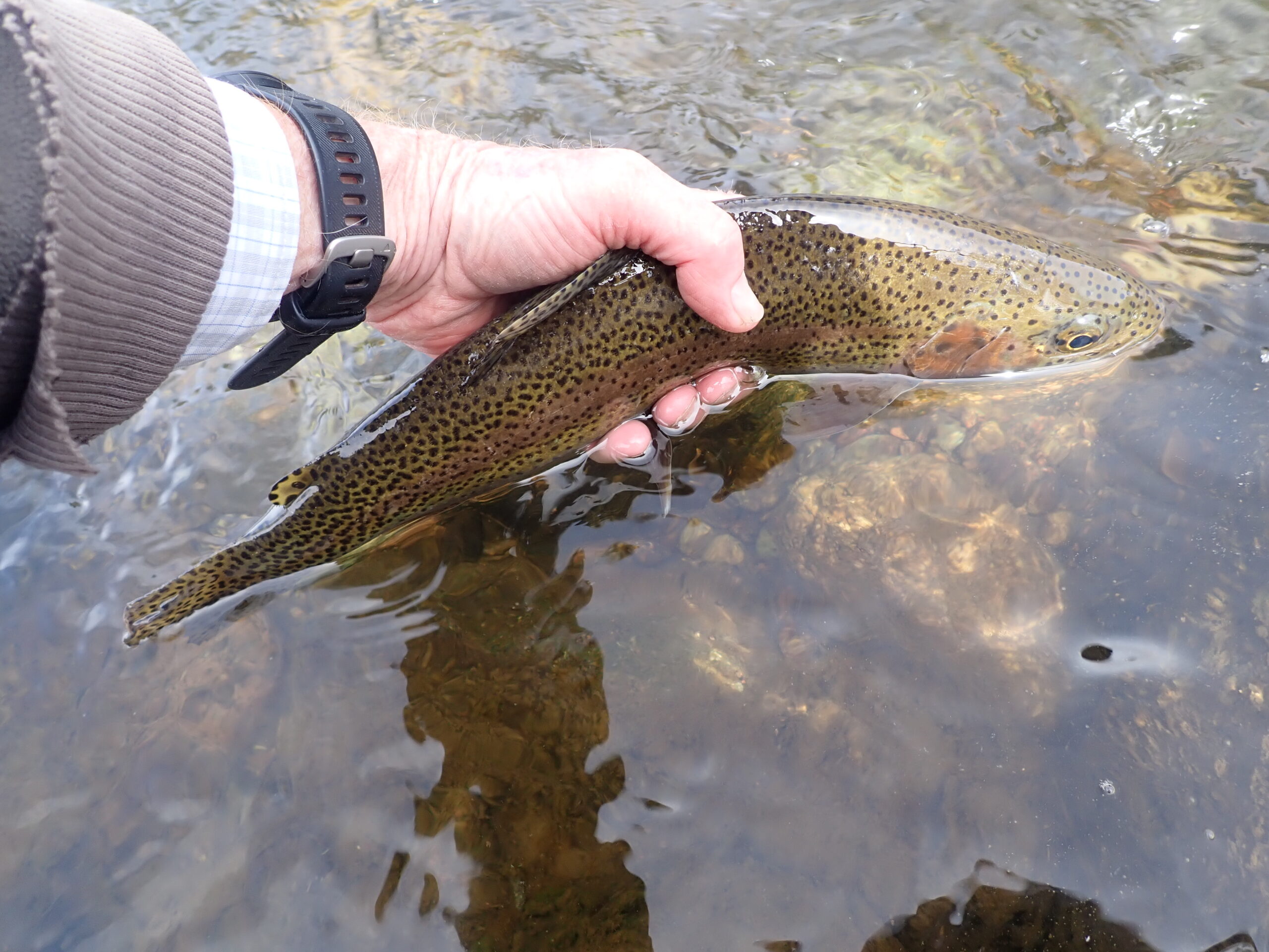 Between 11:00AM and 11:45 I continued to wade up the river, and I built the fish count to six. All the trout grabbed the olive perdigon. If I encountered any riffle or glide with decent depth and moderate current, I was able to generate some action. The fish were on the feed, and I was the beneficiary.