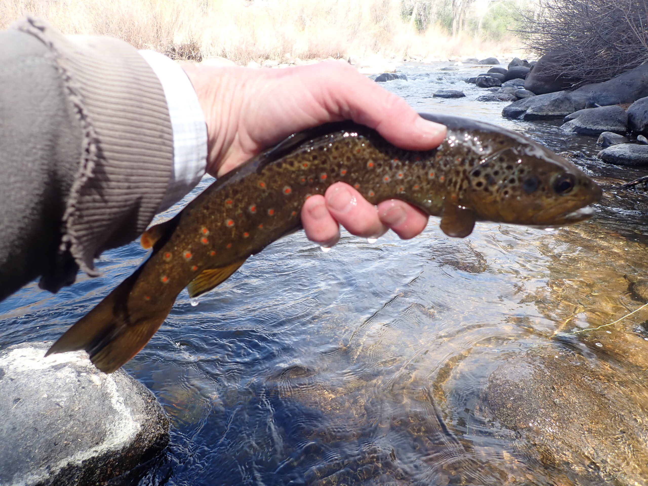 It took an hour to add the two fish after lunch, so it was rather slow going. I did observe three refusals to the chubby Chernobyl, and I shook loose a decent number of caddis, as I waded along the willows. I decided to give a double dry approach a try, so I knotted a peacock hippie stomper to my line and then added a size 14 olive-brown body deer hair caddis. I began prospecting with the dries, and within minutes I landed a small brown trout that recklessly crushed the caddis along the left bank. I directed my casts primarily to the edge of the river along the left bank; however, I did cover very attractive pockets and seams toward the middle of the river. Unfortunately the dry fly experiment did not pay additional dividends, so I abandoned it, as I approached a nice section with deep pockets and runs. I did see two or three fish elevate to inspect the caddis, but they never closed the deal with an eat.
