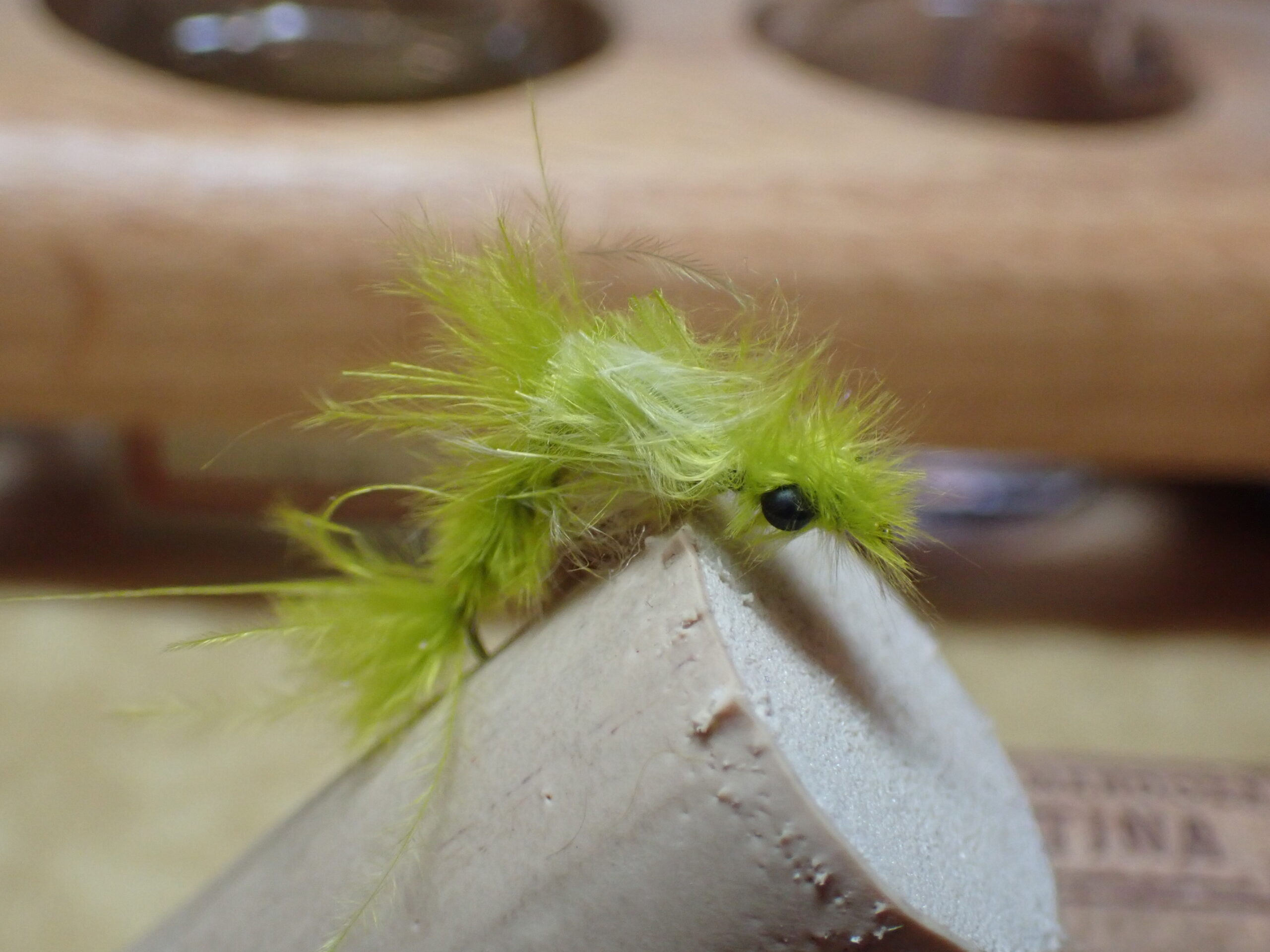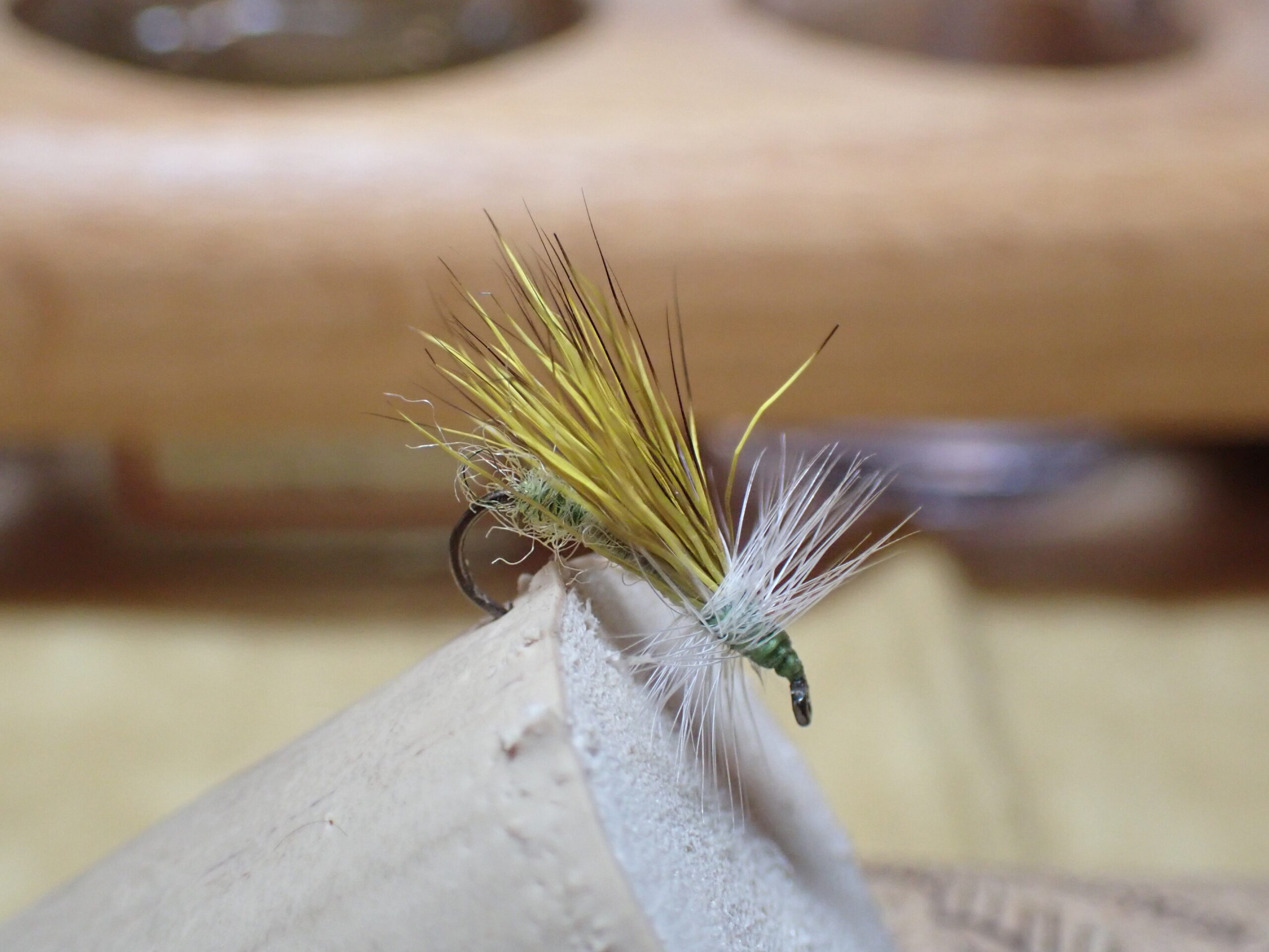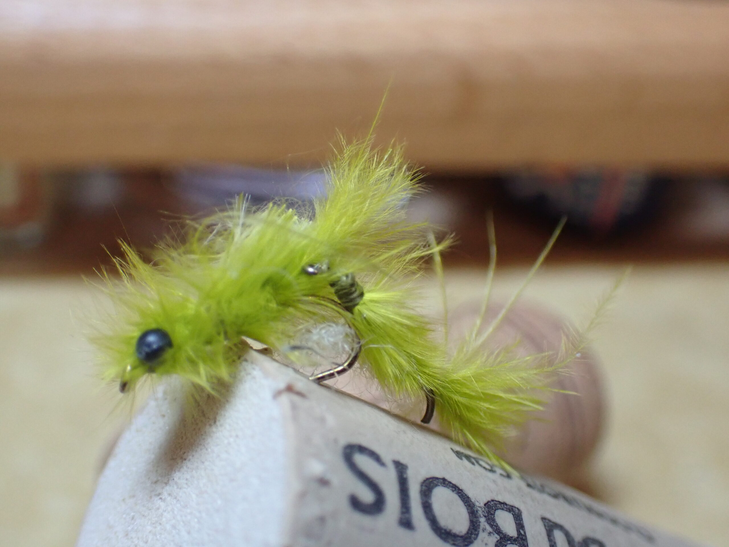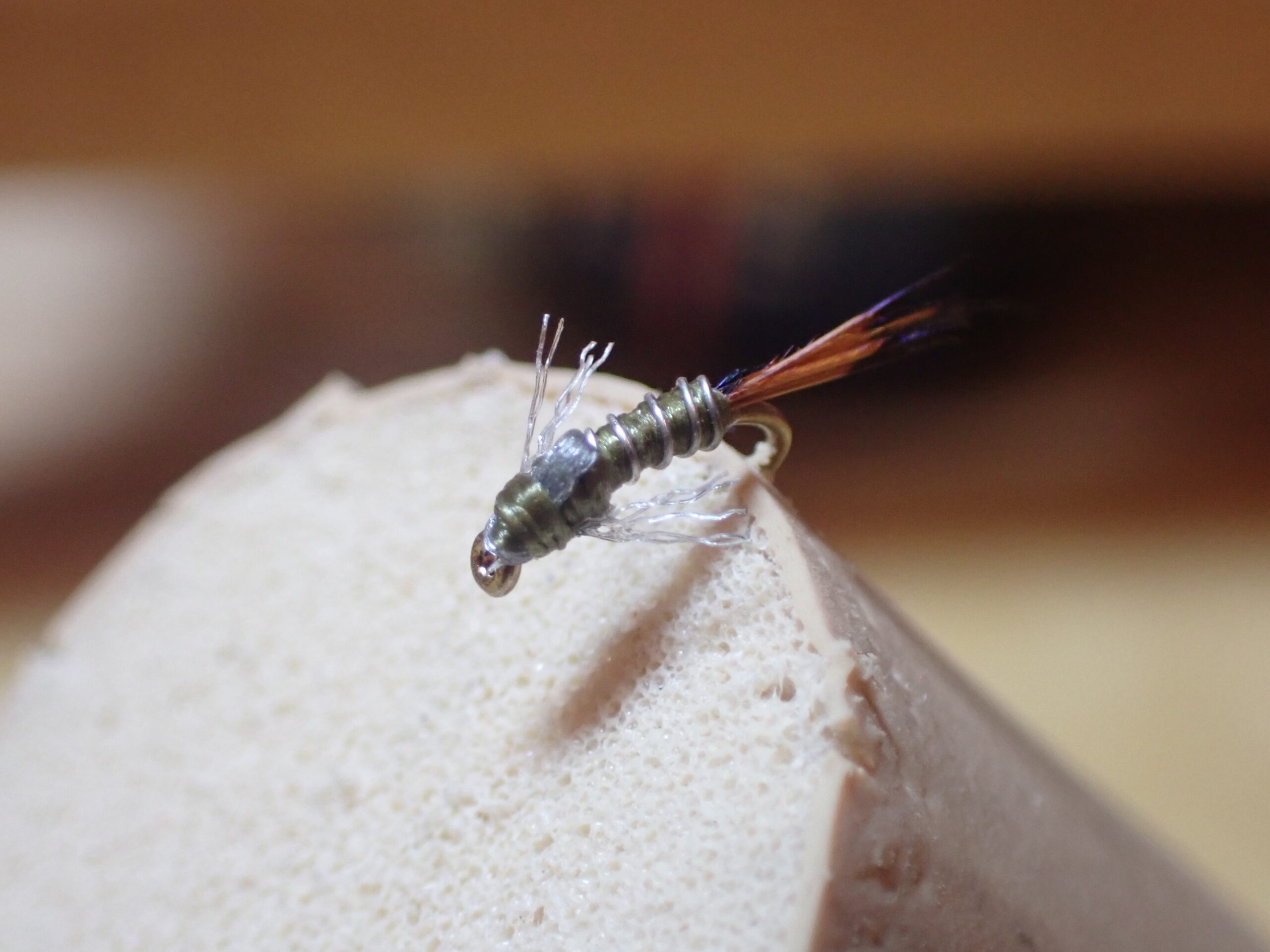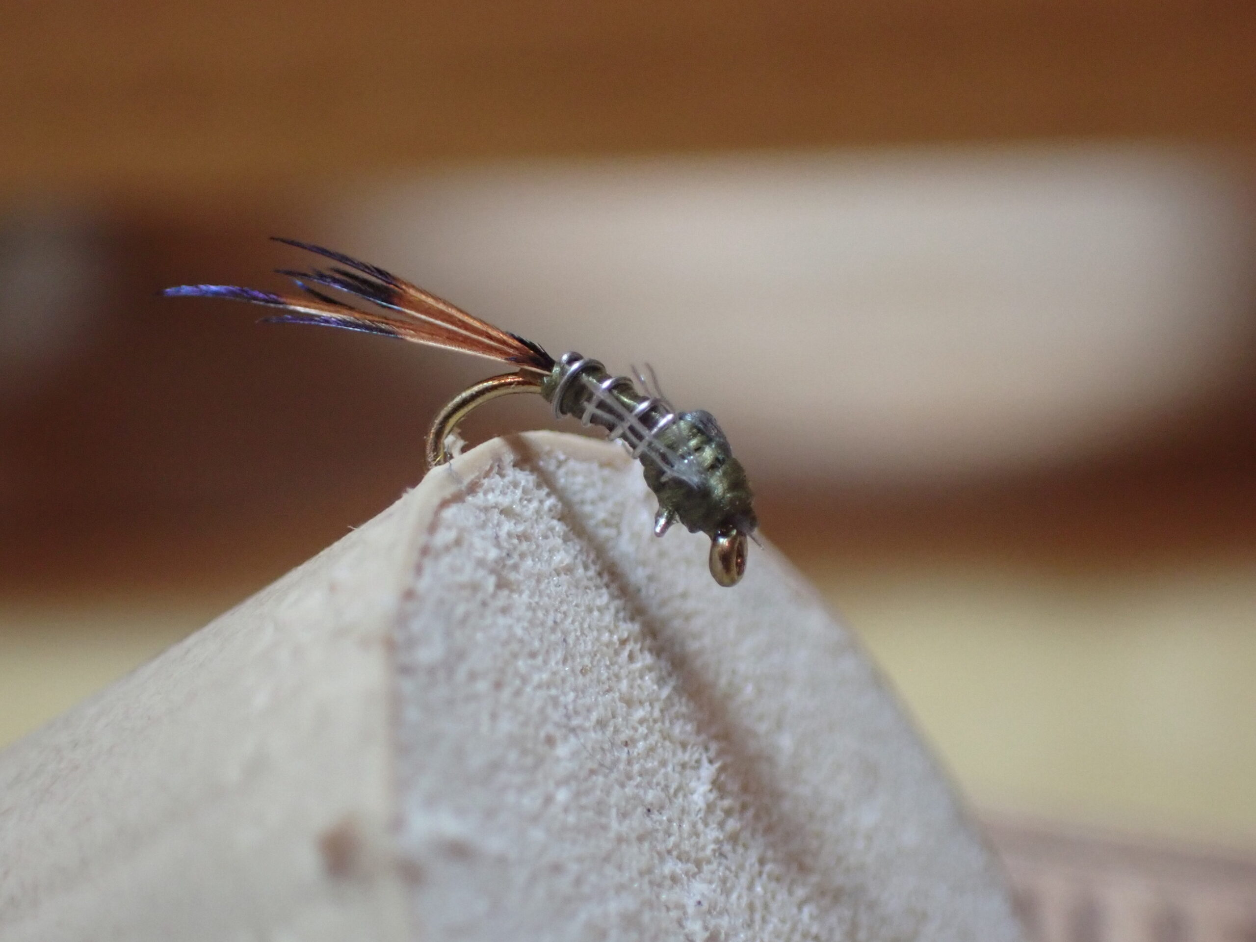 Juan’s example was a brown version of the sniper, but he suggested they could be tied in brown, olive and gray. I decided to go with olive. I did not have the requisite fine black wire, so I substituted silver, and I made the tail from brown ring neck pheasant body feathers. For the legs and wing case, I used gray fluoro fiber. Juan’s fly did not include a bead, so I followed suit in that regard.